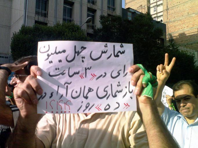 Keywords: Tazahorat sabz (1).JPG Protest demonstration 7th Tir thru Karimkhan to Vali Asr Ave and beyond Tehran Sign reads Counting 40 million votes in 3 hours but recounting the same votes in 10 days myself on behalf of photographer Saba The photographer nicknamed Saba wishes to remain anonymous I have permission from photoghrapher to upload to WikiCommons under PD license Contact me for verification Protests relating to the Iranian presidential election 2009 from 7th Tir to Vali Asr Tehran |