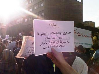 Keywords: Tazahorat sabz (6).JPG Protest demonstration against election results 7th Tir thru Karimkhan to Vali Asr Sq and beyond Tehran Sign reads Article 27 of constitution says unarmed gatherings and demonstrations are free provided they dont disrupt the tenents of Islam myself on behalf of photographer Saba The photographer nicknamed Saba wishes to remain anonymous I have permission from photoghrapher to upload to WikiCommons under PD license Contact me for verification Protests relating to the Iranian presidential election 2009 from 7th Tir to Vali Asr Tehran |