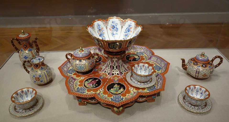 | Keywords: Tea and Coffee Service, Dejeuner chinois reticule, Sevres, Jacinthe Reginer designer, Pierre Huard decorator, marks for 1839 and 1842, hard-paste porcelain - California Palace of the Legion of Honor - DSC07777.JPG en Exhibit in the California Palace of the Legion of Honor San Francisco California USA Photography was permitted in the museum without restriction This work is old enough so that it is in the public domain 2013-11-21 16 04 23 own Daderot other versions cc-zero Sèvres porcelain in the California Palace of the Legion of Honor Uploaded with UploadWizard |