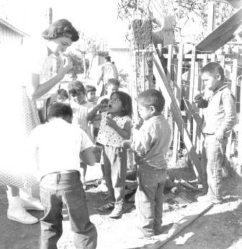 | Keywords: mennonite board of missions mennoniteboardofmissions hygiene treva stutzman trevastutzman blackandwhite monochrome black and white Caption: Treva Stutzman, a volunteer from Goshen, IN teaches Navaho kindergartren children how to brush their teeth. Brushes and paste were supplied by Mennonite Women's Missionary and Service Auxillary groups around the country. Citation: Mennonite Board of Missions. Photographs. Arizona VS/Migrant Units, 1955-1962. IV-10-7.2 Box 2 Folder 1, photo #17. Mennonite Church USA Archives - Goshen. Goshen, Indiana. Caption: Treva Stutzman, a volunteer from Goshen, IN teaches Navaho kindergartren children how to brush their teeth. Brushes and paste were supplied by Mennonite Women's Missionary and Service Auxillary groups around the country. Citation: Mennonite Board of Missions. Photographs. Arizona VS/Migrant Units, 1955-1962. IV-10-7.2 Box 2 Folder 1, photo #17. Mennonite Church USA Archives - Goshen. Goshen, Indiana. |