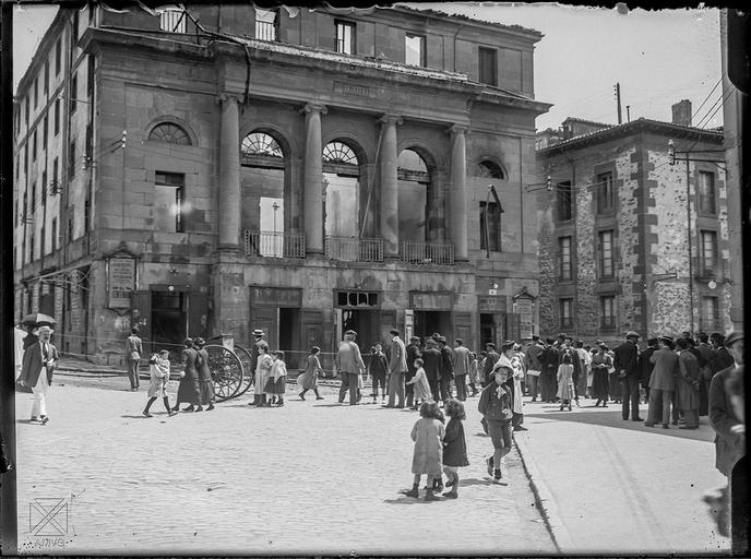 | Keywords: blackandwhite monochrome road outdoor building architecture black and white Gasteizko Principal antzoki zaharra 1914ko sutearen ostean, Argazkia Enrique Guineak egin zuen istripuaren egunean bertan, 1914 abuztuaren 12an. Gasteizko Udal Agiritegia. Heraldo Alavés egunkariak honela jaso zuen albistea: “En las primeras horas de la mañana, a eso de las tres, se ha declarado un violento incendio en el Teatro Principal, quedando únicamente del edificio en pie, la fachada y las paredes maestras. El fuego no pudo ser dominado hasta las cinco, hora en que los bomberos después de ímprobos trabajos lograron localizarlo, atajándolo con brío y acierto. Gracias a la oportunidad de media docena de personas que hallándose en el Café Imparcial y se disponían a retirarse a sus domicilios cuando comenzaron a percibir las llamas, no perecieron en el siniestro las tres únicas personas que habitaban en el Teatro, la mujer e hija del conserje y el propio Nemesio Sososaga. Félix Pérez de Mandojana, Pepe Bajo, Serapio Torio, Casimiro Ullivarri y algunos otros salían del citado café momentos antes de las tres de la mañana. Con gran asombro observaron que de algunos ventanales de la parte alta del Teatro salían abundantes llamas. Dieron la voz de alarma, los serenos hicieron sonar sus silbatos y al propio tiempo, cuantos se encontraban en lugar del suceso comenzaron la ímproba tarea de derrumbar las puertas que daban acceso a las escaleras del gallinero (parte alta del graderío), que es la que utilizaba el conserje para dirigirse a sus habitaciones. Este a pesar del griterío y los golpes dados en las puertas de la fachada, tardó bastante en darse cuenta de la desgracia. Nemesio Sosoaga, intentó escapar por una de las puertas que dan acceso al ambigú (bar) de la parte alta del Teatro, pero al abrirla se encontró una fuerte llamarada, que le hizo retroceder, causándole algunas lesiones en la mano y en la cara. Al percibir la catástrofe que le amenazaba, con su mujer e hija se encaramó por los ventanales próximos al tejado, que es el lugar mas próximo de sus habitaciones y se colocó en la cornisa saliente que presenta la fachada principal del Teatro. Desde este punto daba la desgraciada familia angustiosos gritos, demandando auxilio. Desde la calle procuraban hacerles comprender que habíase ido en busca de la escalera de salvamento. El momento de colocar la escalera en la fachada fue de una ansiedad terrible. Nemesio Sosoaga presa de loca emoción, decía: “que me tiro, que me tiro”. Una vez de colocada la escalera, subieron por ella varios bomberos, los cuales con todo genero de precauciones ayudaron a las victimas del incendio, que se hallaban en el alero de la fachada, a colocarse en la balaustrada de la escalera. Las primeras en descender fueron la mujer y la hija y después este. Los supervivientes de esta catástrofe fueron envueltos en mantas, facilitadas por Francisco Valdecantos y conducidos al domicilio de este, donde las dos mujeres quedaron convenientemente acomodadas en dos camas.” Posteriormente Nemesio, manifestaría al periodista que “de tardar algo mas los auxilios nos hubiéramos visto obligados a caer a la calle, desvanecidos por la axfisiante temperatura que respirábamos y la humareda que nos envolvía.” Egunkari eta data berean, José Cola y Goitik, antzokiaren zenbait ezaugarriren berri ematen digu: “El edificio era uno de los mas bellos de la ciudad. Se alzaba sobre una parte del terreno ocupado por el antiguo hospital de Santiago, según los planos del famoso arquitecto Silvestre Pérez. La primitiva pintura de la sala se debió al italiano Mazonesqui, pero en las grandes y diversas reformas que ha sufrido el edificio desapreció el primitivo decorado, siendo sustituido por otros de mejor gusto. Constaba la sala de tres órdenes de palcos y paraíso y el local era de forma de herradura, rematado en ambos lados con elegantes, cómodos y espaciosos proscenios, con antepalco. En el piso principal existía un saloncillo de descanso, que recibió diferentes reformas. El escenario, sin ser de gran amplitud, reunía buenas condiciones y tenía buena maquinaría. El telón de boca era de mérito grandísimo; representaba sencillamente un inmenso cortinón de terciopelo rojo, con enormes borlones dorados y una ancha y preciosa greca, también dorada, feliz y fiel imitación de la Legia del Vaticano pintada por Miguel Angel. Las decoraciones eran sin duda lo mejor del incendiado coliseo: un gran telón de fondo, imitando pado de alcázar suntuoso, un gran salón ojival, una decoración de selva, otra de jardín, otra de cárcel, otra de una casa pobre, otra de calle y otra de mar, en la que se pintó muchos años después un puerto, por distinta mano. Esas ocho decoraciones fueron pintadas por el artista francés Victor Chenillon , al que el alcalde de entonces José Jorge de Goya encargó la obra que tan satisfactoriamente terminó en el año de 1845.” Gasteizko Principal antzoki zaharra 1914ko sutearen ostean, Argazkia Enrique Guineak egin zuen istripuaren egunean bertan, 1914 abuztuaren 12an. Gasteizko Udal Agiritegia. Heraldo Alavés egunkariak honela jaso zuen albistea: “En las primeras horas de la mañana, a eso de las tres, se ha declarado un violento incendio en el Teatro Principal, quedando únicamente del edificio en pie, la fachada y las paredes maestras. El fuego no pudo ser dominado hasta las cinco, hora en que los bomberos después de ímprobos trabajos lograron localizarlo, atajándolo con brío y acierto. Gracias a la oportunidad de media docena de personas que hallándose en el Café Imparcial y se disponían a retirarse a sus domicilios cuando comenzaron a percibir las llamas, no perecieron en el siniestro las tres únicas personas que habitaban en el Teatro, la mujer e hija del conserje y el propio Nemesio Sososaga. Félix Pérez de Mandojana, Pepe Bajo, Serapio Torio, Casimiro Ullivarri y algunos otros salían del citado c