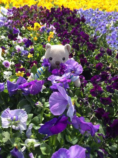Keywords: teddy bear flowers pansies garden toy plush stuffed animal