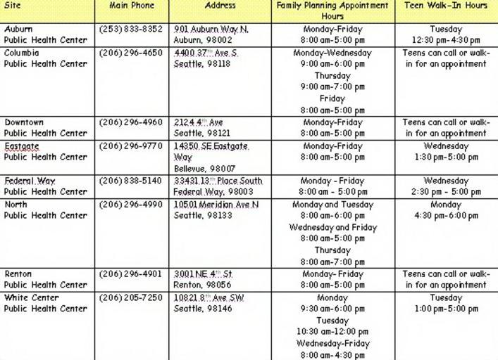Keywords: Teenclinichours.JPG en A chart showing the hours of Teen Clinics in King County Washington State own Celia Thomas 2010-05-01 BadJPEG Tables information Diagrams in English