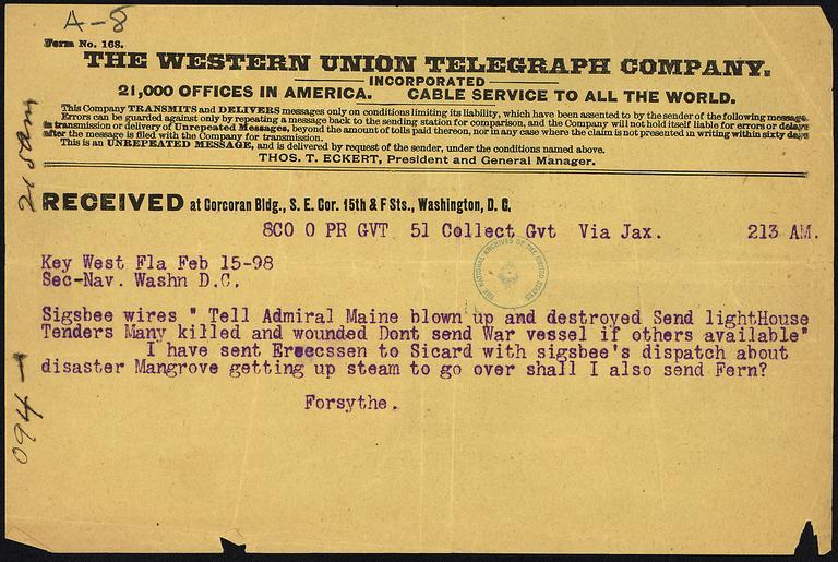 Keywords: Telegram from James A. Forsythe to Secretary of the Navy - NARA - 300264.tif Scope and content This telegram was sent by Captain James A Forsythe Commanding Key West Naval Station forwarding word from Charles S Sigsbee Captain USS MAINE of the sinking of his ship General notes 300264 Local identifier Department of the Navy Office of the Chief of Naval Operations Office of Naval Records and Library 07/01/1919 - 09/1947 Archives I Reference Section Textual Archives Services Division NWCT1R National Archives Building 7th and Pennsylvania Avenue NW Washington DC 20408 date 1898 02 15 - 1898 02 15 Record group Record Group 45 Naval Records Collection of the Office of Naval Records and Library 1691 - 1945 Record group ARC 374 Area Files compiled ca 1924 - ca 1946 documenting the period 1648 - 1927 Series ARC 300258 File unit 11-15 February 1898 02/11/1898 - 02/15/1898 File unit ARC 300263 Variant control numbers NAIL Control Number NWCTB-45-VIIAREAFILE-11TO15FE98-15FEB1898 1 <br /> NAIL Control Number NWDT1-45-VII-AREAFILE-A8-11TO15FE98-15FEB1898 1 yes Other versions <gallery> File Telegram_from_James_A _Forsythe_to_Secretary_of_the_Navy_-_NARA_-_300264 tif tif File Telegram_from_James_A _Forsythe_to_Secretary_of_the_Navy_-_NARA_-_300264 jpg jpg </gallery> NARA-cooperation PD-USGov USS Maine ACR-1 Charles Dwight Sigsbee Montgomery Sicard USS Fern USS Mangrove Spanish-American War NARA TIF images with categorized JPGs |