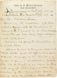 | Keywords: carson city carsoncity nevada statehood abraham lincoln abrahamlincoln u.s. national archives usnationalarchives nye nara:arcid=2642326 telegram lincoln president lincoln presidentlincoln document text monochrome writing Telegram from Nevada Territory Governor Nye to President Abraham Lincoln, 10/30/1864 U.S. National Archives' Local Identifier: MLR Number A1 912, A1 912-B Created by: Department of State. Office of the Secretary. (09/1789 - ) From: Series: Territorial Papers, compiled 1789 - 1873, documenting the period 1764 - 1873 (Record Group 59) Production Date: 10/30/1864 strong>Persistent URL: catalog.archives.gov/id/2642326 Repository: Textual Archives Services Division, National Archives at College Park (College Park, MD) Access Restrictions: Unrestricted Use Restrictions: Unrestricted Telegram from Nevada Territory Governor Nye to President Abraham Lincoln, 10/30/1864 U.S. National Archives' Local Identifier: MLR Number A1 912, A1 912-B Created by: Department of State. Office of the Secretary. (09/1789 - ) From: Series: Territorial Papers, compiled 1789 - 1873, documenting the period 1764 - 1873 (Record Group 59) Production Date: 10/30/1864 strong>Persistent URL: catalog.archives.gov/id/2642326 Repository: Textual Archives Services Division, National Archives at College Park (College Park, MD) Access Restrictions: Unrestricted Use Restrictions: Unrestricted |