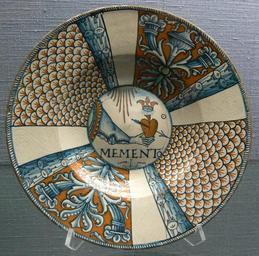 Keywords: Teller Memento KGM K1757.jpg Teller tondino radial geteilt in der Mitte ein Arm mit einem von Amors Liebespfeil durchbohrten Herzen; Anfang 16 Jh <br />Kunstgewerbemuseum Berlin Inv Nr K 1757 own 2009 User FA2010 Ceramics in Kunstgewerbemuseum Berlin Hearts in art Arrows in art Maiolica in Germany Ceramic plates Italian maiolica 16th-century pottery in Italy