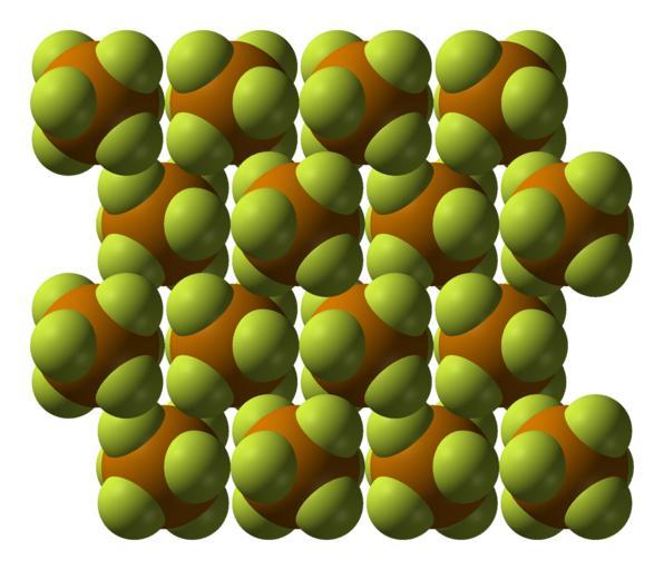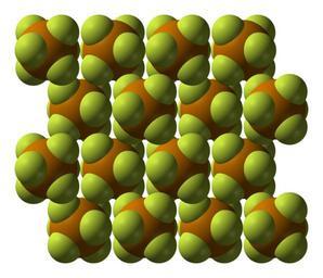 Keywords: Tellurium-hexafluoride-xtal-1992-3D-SF.png Space-filling model of part of the crystal structure of tellurium hexafluoride TeF<sub>6</sub> X-ray crystallographic data from http //dx doi org/10 1080/00268979200100501 Mol Phys 1992 75 689-698 Model constructed in http //www crystalmaker com/ CrystalMaker 8 1 Image generated in http //accelrys com/products/discovery-studio/visualization/discovery-studio-visualizer html Accelrys DS Visualizer Own 2009-05-26 Ben Mills Benjah-bmm27 Images by Ben Mills Tellurium hexafluoride Crystal structures of fluorides |