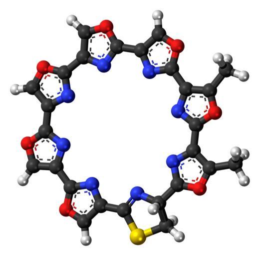 Keywords: Telomestatin-3D-balls.png Ball-and-stick model of the telomestatin molecule a macrocyclic chemical compound Colour code 505050 Carbon C black<br> F0F0F0 Hydrogen H white<br> F51E1E Oxygen O red<br> 3C50FA Nitrogen N blue<br> FAEB00 Sulfur S yellow<br> 2011-06-03 own DS Visualizer Jynto talk Space-filling version cc-zero Oxazoles Macrocyclic compounds Thiazolines Images by Jynto |