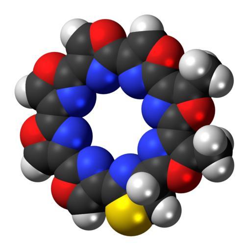 Keywords: Telomestatin-3D-spacefill.png Space-filling model of the telomestatin molecule a macrocyclic chemical compound Colour code 505050 Carbon C black<br> F0F0F0 Hydrogen H white<br> F51E1E Oxygen O red<br> 3C50FA Nitrogen N blue<br> FAEB00 Sulfur S yellow<br> 2011-06-03 own DS Visualizer Jynto talk Ball-and-stick version cc-zero Oxazoles Macrocyclic compounds Thiazolines Images by Jynto |