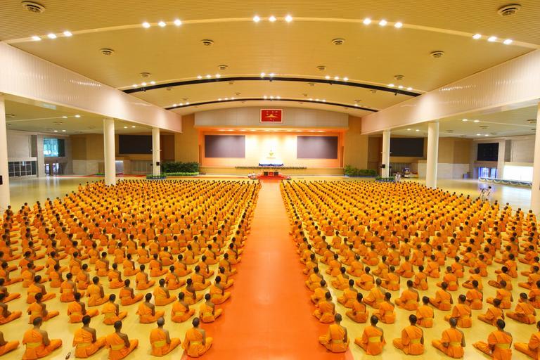 Keywords: temple buddhists monks praying prayer group people buddhism walk orange robes thai ceremony wat phra dhammakaya dhammakaya pagoda more than million budhas gold thailand