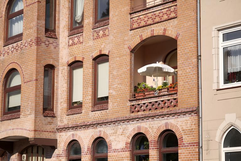 Keywords: tenement house brick balcony summer day parasol flowers idyll protected red rest