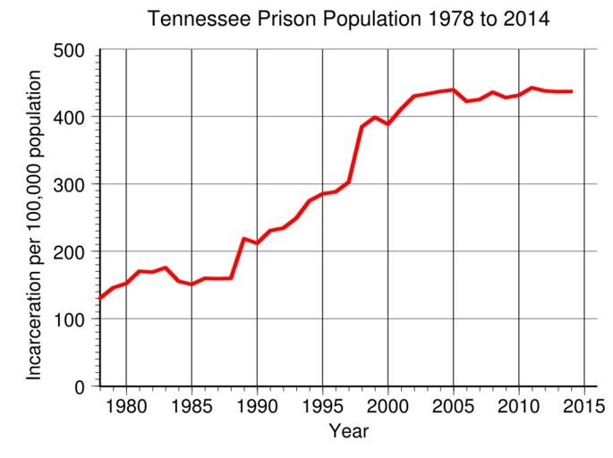 Keywords: Tennessee Prison Population.svg en Tennessee prison incarceration rate per 100 000 population from 1978 to 2014 Data from http //www bjs gov/index cfm ty nps BJS 2016-05-11 own Delphi234 other versions current annually Generated with Wikimedia SVG Chart SVG Chart/box cc-zero Prisons in Tennessee Imprisonment and detention rates in the United States |