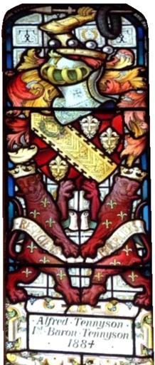 | Keywords: TennysonArms TrinityCollege Cambridge.PNG en Stained glass window in Hall of Trinity College Cambridge England showing arms of Alfred Lord Tennyson Arms Gules a bend nebuly or thereon a chaplet vert between three leopard's faces jessant-de-lys of the second; Crest A dexter arm in armour the hand in a gauntlet or grasping a broken tilting spear enfiled with a garland of laurel; Supporters Two leopards rampant guardant gules semee de lys and ducally crowned or; Motto Respiciens Prospiciens Debrett's Peerage 1968 p 1091 Looking backwards is looking forwards The chaplet on the bend is a special augmentation to the paternal arms http //cuhags soc srcf net/escutcheon/2009-10/ar_trin html Unknown stained glass artist 1884 Trinity College Cambridge Jessant-de-lis in heraldry Alfred Lord Tennyson Tennyson arms Bends nebuly in heraldry Chaplets in heraldry PD-old-100 |