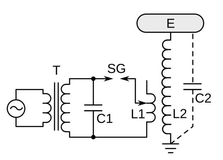 Keywords: Tesla coil circuit.svg Tesla coil a spark-excited resonant transformer circuit invented in 1891 by Nikola Tesla It generates very high voltage radio frequency alternating current electricity at low current levels This is a modern unipolar version commonly used in entertainment coils with a toroidal-shaped metal capacitive load E on the high voltage terminal The primary circuit is shown connected to the primary winding L1 with a variable tap so that the primary and secondary coils can be adjusted to resonance C2 is not an actual capacitor but represents the capacitance of the secondary winding L2 plus the capacitance to ground of the toroidal electrode E 2015-07-27 own Chetvorno other versions cc-zero Uploaded with UploadWizard Tesla coil circuits