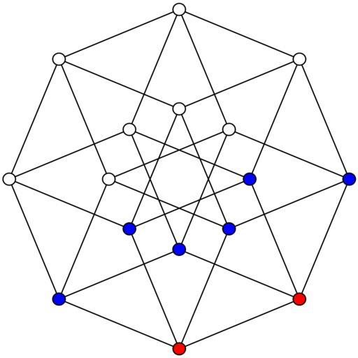Keywords: Tesseract vertex boundary of two nodes.svg en The vertex boundary blue of two nodes red in a tesseract four-dimensional hypercube own Itai 2010-01-31 Based on File Hypercubestar svg Tesseract Petrie polygon