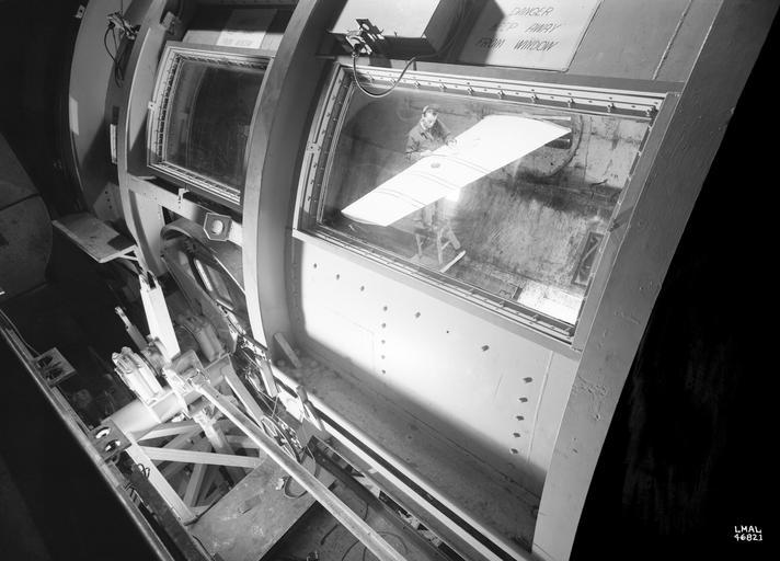 Keywords: high speed tunnel highspeedtunnel langley naca blackandwhite monochrome indoor text black and white Test section of a wind tunnel at Langley as seen through a window from the outside. Test section of a wind tunnel at Langley as seen through a window from the outside. |