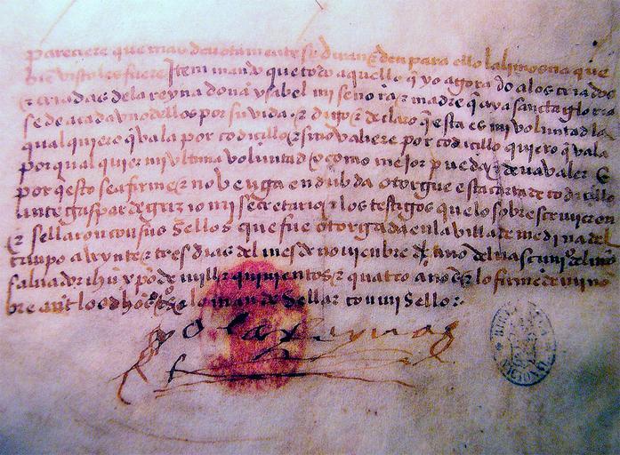 | Keywords: Testamento Isabel Catolica.jpg Will of Isabel I Queen of Castile It can see her signature «Yo la Reyna» that means I the Queen 1504 replica Testamento de Isabel la Católica folio en el que puede verse su firma «Yo la Reyna» 1504 réplica own 2004-11 José-Manuel Benito Locutus Borg Transcription paresçiere que más devotamente se dirán e den para ello la limosna que bien visto les fuere Item mando que todo aquello que yo agora do a los criados e criadas de la reyna donna Ysabel mi sennora e madre que aya sancta gloria se de a cada uno d ™ellos por su vida E digo e declaro que esta es mi voluntad la qual quiero que vala por codiçillo e si no valiere por codiçillo quiero que vala por qualquier mi última voluntad o como mejor pueda e deva valer E por que esto sea firme e no venga em dubda otorgué esta carta de codiçillo ante Gaspar de Grizio mi secretario e los testigos que lo sobreescrivieron e sellaron con sus sellos; que fue otorgada en la villa de Medina del Canpo a veynte e tres dÃas del mes de novienbre de cancelado ano del nasçimiento del Nuestro Salvador Ihesu Christo de mill e quinientos e quatro annos e lo firmé de mi nombre ante los dichos testigos e lo mandé sellar con mi sello Yo la Reyna Documents by Isabella of Castile 16th-century manuscripts Medina del Campo 1504 documents Wills 1504 in Spain |