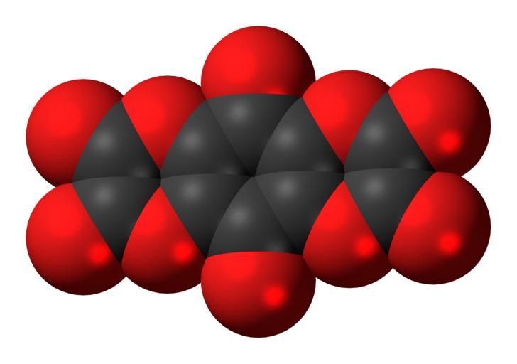 Keywords: Tetrahydroxybenzoquinone-bisoxalate-3D-spacefill.png Space-filling model of the tetrahydroxybenzoquinone bisoxalate molecule an oxocarbon Colour code 505050 Carbon C black<br> F51E1E Oxygen O red<br> 2011-02-20 own DS Visualizer Jynto talk Ball-and-stick version cc-zero Carbon oxides Oxalate esters Quinones Images by Jynto |