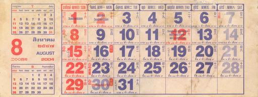 Keywords: Thai August 2004.png Scan of generic Thai calendar page of type printed in bulk for stapling to an advertising poster which depicts August A D 2004/2547 B E the beginning of which corresponded with the beginning of the waning of the Thai Lunar Calendar leap month Moon 8/8 The copyright status of such a calendar page that cannot be attributed to any one source is unknown The scan itself commissioned by me is public domain Created by Pawyilee 2007-02 Pawyilee Public domain Calendars in Thailand August 2004 in Thailand |