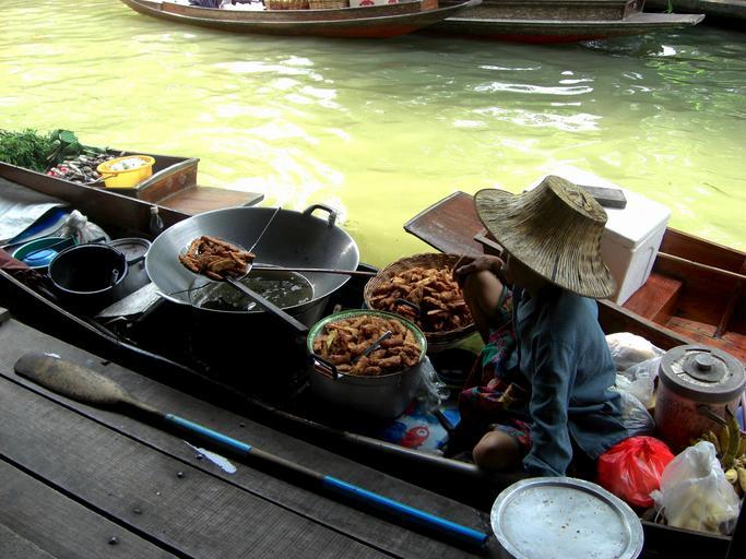 Keywords: thailand boat woman floating-market food cooking business river water pan outside