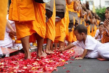Keywords: thailand child buddhists boy monk walk rose petals tradition ceremony people asia bangkok wat phra dhammakaya temple dhammakaya pagoda more than million budhas gold buddhism