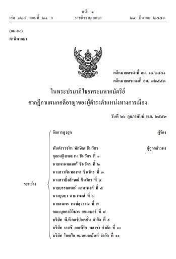 | Keywords: ThaksinConfiscationJudgment-InGovernmentGazette-FirstPage.jpg en The first page of the Government Gazette Volume 127/Part 21 A/Page 1-124/Dated March 24 2010 on which the Judgment of the Supreme Court of Thailand's Criminal Division for Holders of Political Positions in the Black-Number Case No CDHPP 14/2551 and the Red-Number Case No CDHPP 1/2553 'Attorney-General v Thanksin Shinawatra et al ' was published The pictures are pages of judicial decision which is not a copyright-work under Thailand's Copyright Act BE 2537 1994 th หน้าต้นของ ราชกิจจานุ บกษา ฉบับที่ ๑๒๗/ตอนที่ ๒๑ ก/หน้า ๑-๑๒๔/ลงวันที่ ๒๔ มีนาคม ๒๕๕๓ ซึ่งลงประกาศ คำพิพากษาศาลฎีกาแ นกคดีอาญาของ ู้ดำรงตำแหน่งทางการ มือง ในคดีหมาย ลขดำที่ อม ๑๔/๒๕๕๑ และคดีหมาย ลขแดงที่ อม ๑/๒๕๕๓ ระหว่าง อัยการสูงสุด กับพันตำรวจโททักษิณ ชินวัตร และพวก ภาพนี้ ป็นส่วนหนึ่งของคำวินิจฉัยขององค์กรตุลาการไทย ซึ่งมิใช่งานอันมีลิขสิทธิ์ตามพระราชบัญญัติลิขสิทธิ์ พ ศ ๒๕๓๗ own Clumsy 2010-04-19 PD-TH-exempt Thaksin Shinawatra's assets confiscation case |