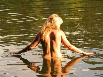 Keywords: the act of girl woman water lake river nudity body blonde the back reflection touch