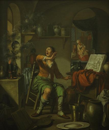 | Keywords: The Alchemist’s Experiment Takes Fire 1687 CHF fa 2000.001.276.JPG Artwork Creator Hendrick Heerschop The alchemist's experiment has erupted in a fire with glass shattering in midair and smoke billowing upward In foreground an explosion at left shows smoke fire and flying glass shards from a shattered alembic Another alembic and receiver can be seen behind the chymist's upraised arm The luting used to seal the mouth of the receiving bottle to the beak of the alembic is clearly visible The alchemist is seated awkwardly in his chair with a startled expression on his face His chair has only one leg on floor and he is moving toward an open book showing the artist's name He is seated near a table with a red cloth and open book Foreground floor has bellows mortar and pestle and a pewter plate with a piece cut from its rim suggesting that the chymist has been attempting to turn base metals into gold or silver Through an arched doorway in right background we see an adjoining room where a seated woman presumably the alchemist's wife wipes her baby's bottom A second child stands nearby This painting is an example of Dutch Golden Age painting The colors are bright and cheerful a red cloth is on the table; blue cloth is in the background and the alchemist wears green trousers 1687 Oil canvas board inch 17 5 21 Institution Chemical Heritage Foundation object history exhibition history credit line Gift of Fisher Scientific International CHF Collections http //www chemheritage org/discover/collections/collection-items/fine-art/the-alchemists-experiment-takes-fire-fa-2000-001-276 aspx Chemical Heritage Foundation Photograph by Will Brown Image downloaded with permission from the Chemical Heritage Foundation as part of the Wikipedian in Residence initiative CHF-cooperation PD-old-100-1923 cc-by-3 0 Chemical Heritage Foundation accession number FA 2000 001 276 Hendrick Heerschop Images from the Chemical Heritage Foundation Alchemists in art 17th-century oil on canvas paintings Explosions People with fire in art 1687 paintings Green trousers |