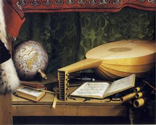 | Keywords: The Ambassadors, detail of globe, lute, and books, by Hans Holbein the Younger.jpg Double Portrait of Jean de Dinteville and Georges de Selve called The Ambassadors technique oil tempera oak National Gallery London This lower shelf between the two ambassadors shows a terrestrial globe a lute a Lutheran hymn book an arithmetic book dividers and a bag of wooden flutes A theme of disharmony is suggested perhaps referring to the religious context of the ambassadors' mission the lute has a broken string the arithmetic book lies open on a division page and one of the flutes juts out from the rest Buck 98 Stephanie Buck Hans Holbein Cologne Könemann 1999 ISBN 3829025831 Creator Hans Holbein d J 1533 Museum National Gallery London 80px80px PD-old-100 Lutes in art Renaissance lutes Still-life paintings of musical instruments Details of The Ambassadors Holbein lute Broken Strings |