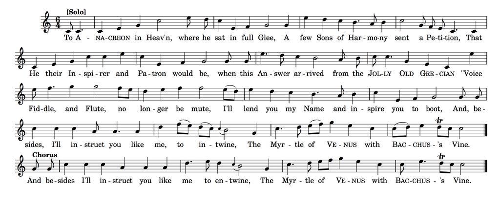 | Keywords: The Anacreontic Song.png en Melody of The Anacreontic Song from the first Longman Broderip edition c 1780 Transcribed and typeset in Lilypond by the uploader 1780 http //lcweb2 loc gov/diglib/ihas/loc natlib ihas 100000012/default html Ralph Tomlinson / Anon John Stafford Smith other versions Generated from the following Lilypond source with the command <code>lilypond anacr ly</code> <pre> \version 2 18 2 set-default-paper-size a4 'landscape myMelody c8 \markup \bold Solo c4 c4 e4 g4 c2 e8 d8 c4 e 4 f4 g2 g4 e'4 d4 c4 b4 a8 b4 c2 g8 f8 e8 c4 c4 \break c4 e4 g4 c4 c4 e4 c4 e 4 f4 g2 g8 g8 e'4 d8 c4 b2 a8 b8 c8 c4 g4 e4 c4 e'4 \break e8 f4 g4 g2 f8 e8 d4 e4 f4 f2 e8 d8 e4 d4 c4 b4 a8 b4 c4 e 4 f4 g2 g8 g8 \break c4 c4 c4 a8 a4 a4 d4 f8 e8 d8 c8 \appoggiatura c4 b2 g4 c4 d8 e8 f8 g4 e4 c4 c8 d8 e4 d8\trill c8 c2 \bar \break g8 \markup \bold Chorus g8 c4 c4 c4 a4 a4 a4 d4 e8 d4 \appoggiatura c4 b2 g4 c4 d8 e8 f8 g4 e4 c4 c8 e4 d8\trill c8 c2 \bar myLyrics \lyricmode To \markup\smallCaps A -- \markup\smallCaps na -- \markup\smallCaps creon in Heav'n where he sat in full Glee A few Sons of Har -- mo -- ny sent a Pe -- ti -- tion That He their In -- spi -- rer and Pa -- tron would be when this An -- swer ar -- rived from the \markup\smallCaps Jol -- \markup\smallCaps ly \markup\smallCaps Old \markup\smallCaps Gre -- \markup\smallCaps cian \ Voice Fid -- dle and Flute no lon -- ger be mute I'll lend you my Name and in -- spire you to boot And be -- sides I'll in -- struct you like me to in -- twine The Myr -- tle of \markup\smallCaps Ve -- \markup\smallCaps nus with \markup\smallCaps Bac -- \markup\smallCaps chus -- 's Vine And be -- sides I'll in -- struct you like me to en -- twine The Myr -- tle of \markup\smallCaps Ve -- \markup\smallCaps nus with \markup\smallCaps Bac -- \markup\smallCaps chus -- 's Vine PUTTING IT ALL TOGETHER anacrMelody \autoBeamOff \time 6/4 \key c \major \partial 2 \relative c' \myMelody anacrLyrics \set associatedVoice anacrMelody \myLyrics allMelody \new Voice melody \anacrMelody allLyrics \new Lyrics \lyricsto melody \anacrLyrics anacrStaff \new Staff << \allMelody \allLyrics >> disableBarNumbers \context Score \applyContext set-bar-number-visibility 1000 anacrScore \score << \disableBarNumbers \anacrStaff >> anacrBook \book \header tagline remove footer \anacrScore \anacrBook END </pre> PD-old-100-1923 Uploaded with UploadWizard To Anacreon in Heaven |