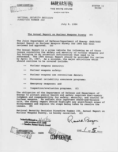 | Keywords: The Annual Report on Nuclear Weapons Surety - NARA - 198337.tif Scope and content General notes 198337 Local identifier President 1981-1989 Reagan National Security Council 1981 - 1989 Ronald Reagan Library NLRR 40 Presidential Drive Simi Valley CA 93065-0600 1986-07-08 Record group Collection RR-NSC Numbered National Security Policy Papers 1981 - 1989 Record group ARC 1189 National Security Decision Directives compiled 02/25/1981 - 01/19/1989 Series ARC 198166 File unit File unit ARC Variant control numbers NAIL Control Number NLS-NSC-NSDD-230 yes Other versions <gallery> File The_Annual_Report_on_Nuclear_Weapons_Surety_-_NARA_-_198337 tif tif File The_Annual_Report_on_Nuclear_Weapons_Surety_-_NARA_-_198337 jpg jpg </gallery> NARA-cooperation PD-USGov Presidential Decision Directives Reagan NARA TIF images with categorized JPGs |