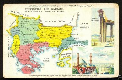 | Keywords: The Balkans, as per the Treaty of Bucharest of 1913.jpg en Postcard issued in 1913 or 1914 Retailers and manufacturers such as the Belgian starch manufacturer Amidon Rémy often used the postcard format for advertising Colourful maps current events royal visits colonial scenes etc plus a commercial logo or slogan here in French and Flemish 2012-04-07 Auction Website Amidon Rémi PD-old-70-1923 Uploaded with UploadWizard Vintage post cards Maps of the Second Balkan War Treaty of Bucharest 1913 Maps of the history of the modern Balkans Maps of Serbia during the Balkan Wars Maps of the history of Montenegro in modern times Maps of the history of Bulgaria in modern times Maps of the history of Greece Maps of the history of Albania in modern times Postcards of Belgium |