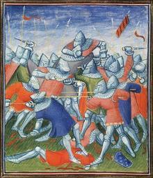 Keywords: The battle of Auray.jpg en Jean Froissart Chroniques Vol I The battle of Auray Place of origin date Paris Virgil Master illuminator ; c 1410 Material Vellum ff 382 385x288 243x187 mm 42 lines littera cursiva Binding 18th-century brown leather; gilt; with coat of arms of Stadholder William V Decoration 1 two-column miniature 170x180 mm ; 29 column miniatures 115/65x95/80 mm ; 1 historiated initial 45x50 mm ; decorated initials with border decoration ff 1r 24r 36r 62r 74v etc Provenance Louis de Luxemburg conn štable de France d 1475; signature erased ; by descent to his granddaughter Françoise de Luxembourg and her husband Philip of Cleves d 1528; coat of arms with label over erasure; signature ; purchased in 1531 from Philip's estate by HenriIII Count of Nassau d 1538 ; by descent to the Princes of Orange-Nassau the later Stadholders at The Hague; carried off in 1795 to Paris by the French and restituted to the Koninklijke Bibliotheek in 1816 http //www kb nl/manuscripts/show/manuscript/72+A+25 Jean Froissart Chroniques Vol I Virgil Master illuminator ca 1410 Battle of Auray Chroniques de Froissart vol 1 - Den Haag KB 72 A 25 c 1410 Medieval miniatures of battles Hundred Years' War PD-old-100 |