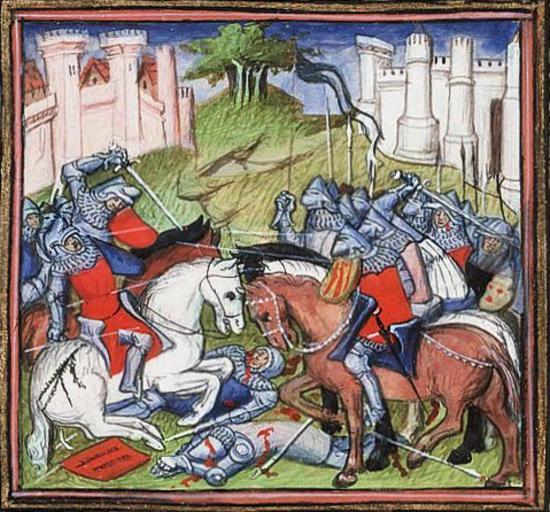 Keywords: The battle of Calais.jpg en Jean Froissart Chroniques Vol I The battle of Calais Place of origin date Paris Virgil Master illuminator ; c 1410 Material Vellum ff 382 385x288 243x187 mm 42 lines littera cursiva Binding 18th-century brown leather; gilt; with coat of arms of Stadholder William V Decoration 1 two-column miniature 170x180 mm ; 29 column miniatures 115/65x95/80 mm ; 1 historiated initial 45x50 mm ; decorated initials with border decoration ff 1r 24r 36r 62r 74v etc Provenance Louis de Luxemburg conn štable de France d 1475; signature erased ; by descent to his granddaughter Françoise de Luxembourg and her husband Philip of Cleves d 1528; coat of arms with label over erasure; signature ; purchased in 1531 from Philip's estate by HenriIII Count of Nassau d 1538 ; by descent to the Princes of Orange-Nassau the later Stadholders at The Hague; carried off in 1795 to Paris by the French and restituted to the Koninklijke Bibliotheek in 1816 http //www kb nl/manuscripts/show/manuscript/72+A+25 Jean Froissart Chroniques Vol I Virgil Master illuminator ca 1410 Edward III of England Chroniques de Froissart vol 1 - Den Haag KB 72 A 25 c 1410 Medieval miniatures of battles Bataille de Calais PD-old-100 |