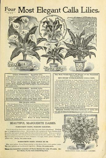 Keywords: The best homes in America plant my flowers, why not you? (16388386592).jpg fe Most Elegant Calla Lilies <br> CALLA ETHIOPICA Egyptian Lily <br> This is the well-known Egyptian Lily or Lily of the Nile <br> with large white flowers broad foliage and it will prosper <br> under very adverse circumstances If you want large Cal- <br> las send to me as I am headquarters for them I have three <br> sizes Price small plants to bloom next Winter 10 <br> cents each; strong blooming bulbs 25 cents each; <br> extra strong bulbs that will produce a dozen blooms <br> 50 cents each <br> CALLA RICHARDIA Spotted Calla <br> A plant wilh beautiful spotted leaves It flowers abund- <br> antly during the Summer months when planted out in the <br> open border The flowers are shaped like those of a Calla <br> and are pure white shaded with violet inside Keep dry in <br> Winter and start in the Spring like a Dahlia Tne plant <br> belongs to the same order as Calla Ethiopica Price <br> blooming bulbs 10 cents each; large bulbs to pro- <br> duce an abundance of bloom 25 cents each <br> THE BLACK CALLA <br> The introducer says Its flowers are enormous fully afoot <br> in length Color a clear coal black so intense that it really <br> shows a brilliancy and as may well be imagined it is a flow- <br> er of the most striking oddity and beauty The bulbs are <br> large and should be potted in the Fall and when growth <br> commences set in a window After blccixiag tie foliage <br> will die down and the bulb should be kept dry for planting <br> again in the Fall It is a native of the Holy Lanrf Treat <br> same as for White Caila Lily This is a very beautiful Lily <br> I have flowered it extensively It is coal black and is a great <br> curiositv It is very scarce Price of large flowering <br> bulbs 30 cents each <br> The Most Wonderful oJ All Plants of the Beautifttl <br> Lily Family the <br> NEW DWARF EVER-BLOOMING CALLA LILY <br> It is my good fortune to have come into possession of this <br> most valuable of all Callas The following facts will con- <br> vince any one of its great superiority over the old sorts It <br> is of dwarf habit and does not grow tall and scraggy like the <br> old variety but is compact with a great abundance of lus- <br> trous dark green foliage It is a true ever-bloomer its flow- <br> ers appearing in great abundance both Summer and Winter <br> when grown in pots or it will bloom profusely all Summer <br> long in the open ground and being potted in September will <br> continue blooming without intermission all Winter The <br> same plant will grow and bloom for years without once <br> ceasing and the quantity of bloom which a gnod plant will <br> produce is astonishing It is estimated that six plantsof the <br> old sort will not produce so many flowers in the course of a <br> year as will one plant of this new dwarf variety A large <br> plant is hardly ever without one or more flowers and its <br> dwarf compact habit makes a much more desirable pot plant <br> than the old variety Its flowers are large and snow-white <br> in color All in all it is one of the most desirable plants I <br> ever offered Price bulbs of blooming size 25 cents <br> each; extra large size 50 cents each <br> SPECIAL OFFER ” The lour varieties of Calla Lil- <br> ies all of beat btoosgi ng si z e f of esSy ST <br> BEAUTIFUL MARGUERITE DAISIES <br> MARGUERITE DAISY MADAME GAILBERT <br> This is one of the finest new plants that has ever been introduced Nothing <br> ean be imagined that is finer All know the old varieties of Paris Daisies how <br> beautiful and much sought af er for decoration of all kinds This new variety <br> blooms constantly and will produce ten blooms to the old variety's one Noth- <br> ing is so airy and graceful as these blossoms cf large white petals showing a <br> yellow disc Price 10 cents each <br> MARGUERITE DAISY ETOILE DE OR <br> The new yellow Paris Daisy similar to the above but a rich golden color <br> The two varieties go handsomely together Price 10 cents each <br> These two beautiful varieties of Paris Daisies for only 15 cents Or- <br> der them if you want something nice <br> MARGUERITE DAISY MADAME GAILBERT 41847004 130961 64578 Text http //www biodiversitylibrary org/page/41847004 1899 10 5962/bhl title 64578 Ella V Baines Firm ; Henry G Gilbert Nursery and Seed Trade Catalog Collection NameFound Calla ethiopica NameConfirmed Calla aethiopica L EOLID 1127679 NameBankID 611142 NameFound Ethiopica NameConfirmed Ethiopica EOLID 66302 NameBankID 4162235 NameFound Richardia NameConfirmed Richardia EOLID 29640 NameBankID 387684 Biodiversity Heritage Library Miss Ella V Baines the Woman Florist Springfield Ohio The best homes in America plant my flowers why not you Garden Stories Bulbs Plants Catalogs Flowers Plants Ornamental Seed industry and trade Seeds Trade catalogs U S Department of Agriculture National Agricultural Library bhl page 41847004 dc identifier http //biodiversitylibrary org/page/41847004 bhlGardenStories BHLinbloom bulbs plants plants ornamental u s department of agriculture national agricultural library bhlgardenstories bhlinbloom Information field Flickr posted date ISOdate 2015-01-28 CC-BY-2 0 BioDivLibrary https //flickr com/photos/61021753 N02/16388386592 2015-08-24 07 55 05 cc-by-2 0 PD-old-70-1923 Photos uploaded from Flickr by Fæ using a script The best homes in America The best homes in America plant my flowers, why not you? (16388386592).jpg fe Most Elegant Calla Lilies <br> CALLA ETHIOPICA Egyptian Lily <br> This is the well-known Egyptian Lily or Lily of the Nile <br> with large white flowers broad foliage and it will prosper <br> under very adverse circumstances If you want large Cal- <br> las send to me as I am headquarters for them I have three <br> sizes Price small plants to bloom next Winter 10 <br> cents each; strong blooming bulbs 25 cents each; <br> extra strong bulbs that will produce a dozen blooms <br> 50 cents each <br> CALLA RICHARDIA Spott