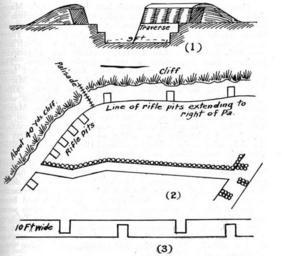 | Keywords: The british sap at te arei.jpg en The British Sap at Te Arei 1 Cross-section of the sap with traverse and gabions 2 Head of the sap close to Maori works Te Arei in March 1861 3 Remains of the sap near north face of Te Arei pa as existing at the present time The New Zealand Wars James Cowan 1922 Pukerangiora Taranaki New Zealand History of New Zealand James Cowan New Zealand writer PD-old | ||||