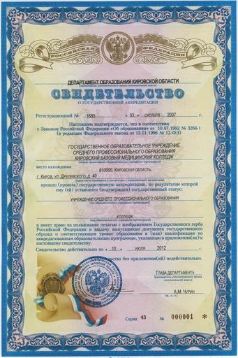 | Keywords: The certificate of state accreditation of MCK.jpg en The certificate of state accreditation of Medical college of Kirov ru Свидетельство о госуда ственной акк едитации Ки овского медицинского колледжа http //kbmk kirov ru/akk html 2007 Medical college of Kirov PD-RU-exempt |