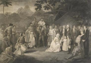 Keywords: The Cession of the District of Matavai in the Island of Otaheite to Captain James Wilson for the use of the Missionaries Sent Thither by that Society in the Ship Duff, engraving by Francesco Bartolozzi.jpg en The Cession of the District of Matavai in the Island of Otaheite to Captain James Wilson for the use of the Missionaries A version of the painting from the School of Oriental and African Studies possibly the original by Robert Smirk The original painting by Robert Smirk was commissioned by the Directors of the London Missionary Society in 1798 to commemorate the grant of land to build a mission in Tahiti which occurred in March 16 1797 In the background is Mt Aora'i The dwelling immediately behind the group is Bligh's 'British house' The end section of the first missionary house is on the right The identification of the figures in the painting can be found on pages xiii and 32 of Colin Newbury's edited book http //samples sainsburysebooks co uk/9781409417217_sample_1057810 pdf The History of the Tahitian Mission 1799-1830 Written by John Davies Missionary to the South Sea Islands With Supplementary Papers of the Missionaries http //www bbc co uk/arts/yourpaintings/paintings/the-cession-of-matavai-in-tahiti-to-captain-james-wilson-124045 1801 Robert Smirke <gallery>File The Cession of the District of Matavai in the Island of Otaheite to Captain James Wilson for the Use of the Missionaries Sent Thither by that Society in the Ship Duff 1801 jpg File The Cession of the District of Matavai in the Island of Otaheite to Captain James Wilson for the use of the Missionaries Sent Thither by that Society in the Ship Duff engraving by Francesco Bartolozzi jpg</gallery> Robert Smirke painter History of Tahiti People of Tahiti London Missionary Society Missionaries Tahiti Tahiti in art Pōmare I Pōmare II James Wilson explorer PD-old-100 |