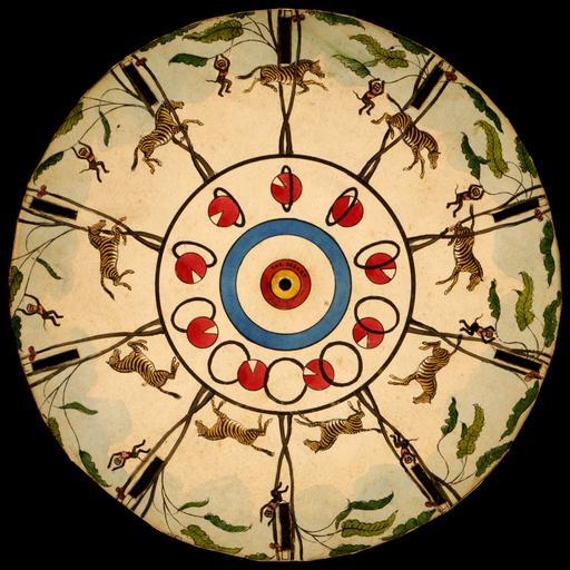 | Keywords: The Desert (LOC cph.3g08083).jpg ;TITLE The desert ;CALL NUMBER LOT 10527 no 11 P P ;REPRODUCTION NUMBER LC-USZC4-8083 color film copy transparency ;MEDIUM 1 print on disc lithograph hand-colored ; 24 cm ;CREATED/PUBLISHED Haymarket London Published by Thos McLean 1833 ;NOTES Optical illusion disc which is spun displaying the illusion of motion of a ball with a wedge-shaped piece missing passing through a hoop and of a monkey swinging on branches of a tree and a zebra jumping through an opening between two trees in a circle at the outer edge of the disc Published in McLean's optical illusions; or magic panorama London T McLean 1833 ;SEE ALSO 250px loc-image cph 3g08083 Phenakistoscope PD-old |