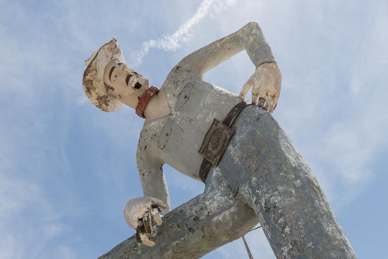 | Keywords: The deteriorating remains of "Tex Randall," a very big Texan (47 feet tall and weighing seven tons) erected in the city of Canyon in the Texas panhandle by industrial-arts teacher Harry Wheeler in LCCN2014633870.tif 1 photograph digital tiff file color Notes Tex is constructed of concrete with an internal structure of pipe rebar and wire mesh He originally wore real denim jeans and a red checkered shirt courtesy of a local tent and awning store He casually held a giant cigarette in one hand His sturdy design has helped him survive 100-mph winds along with a network of steel struts and cable anchoring him to the ground As he aged Tex was hobbled when a semi-trailer truck smashed one of his feet and later a sniper shot away his smoke A local restoration campaign saved the giant cowpoke in 1989 when a spur tastefully replaced the dangling cigarette and another such effort was underway as of the date of this photograph in 2014 ; Title date and keywords based on information provided by the photographer ; Gift; The Lyda Hill Foundation; 2014; DLC/PP-2014 054 ; Forms part of Lyda Hill Texas Collection of Photographs in Carol M Highsmith's America Project in the Carol M Highsmith Archive ; Credit line The Lyda Hill Texas Collection of Photographs in Carol M Highsmith's America Project Library of Congress Prints and Photographs Division 2014 Creator Carol M Highsmith Library of Congress Catalog http //lccn loc gov/2014633870 Image download https //cdn loc gov/master/pnp/highsm/29600/29670a tif Original url http //hdl loc gov/loc pnp/highsm 29670 No known restrictions on publication LOC-image highsm 29670 34 59 0891 0 N 101 55 7837 0 W alt 1084_source exif_heading PD-Highsmith Images uploaded by Fæ Lyda Hill Texas Collection of Photographs in Carol M Highsmith's America Project in the Carol M Highsmith Archive The Lyda Hill Texas Collection of Photographs in Carol M Highsmith's America Project Library of Congress Prints and Photographs Division Photographs by Carol M Highsmith |