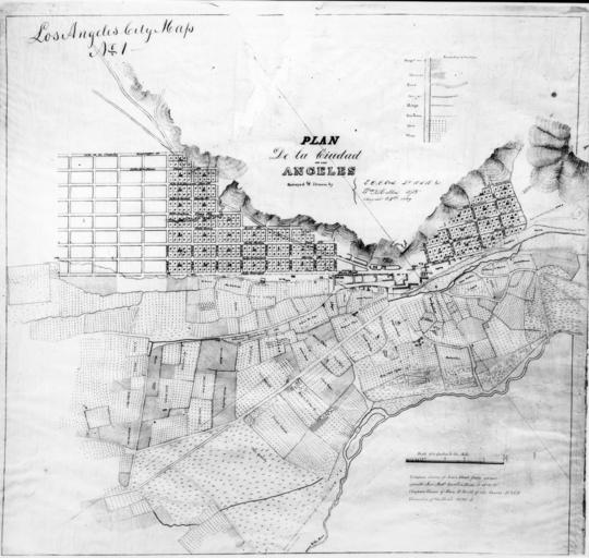 | Keywords: The E.O.C. Ord's first map of the city of Los Angeles, drawn in August 29, 1849 (CHS-6040).jpg Photograph of the E O C Ord's first map of the city of Los Angeles drawn in August 29 1849 The grid up north near the mountains represent downtown Los Angeles The blocks in downtown Los Angeles are further divided into numbered sections The lower half of the map represents the greater Los Angeles area which is broken into smaller sections and labeled with names a majority of which are Spanish or Mexican names of the landowners ; Legible writings include Los Angeles city map no 1 plan de la ciudad de los Angeles surveyed and drawn by E O C Ord Lt U S A Wm R Hutton afst August 29 1849 explanation of signs plough ground gardens road sanja hedge pole fence corn vines calle de las Chapulas Grasshopper St calle de las Flores Flower St calle de las Esperanza Hope St calle de las Caridad Charity St calle Acey Zuna Olive St calle Loma Hill St calle Fortin Fort St calle Primarera Spring St calle Principal Main St calle 1 1st St calle 2 2nd St calle 3 3rd St calle 4 4th St calle 5 5th St calle 6 6th St calle 7 7th St calle 8 8th St c corla Short St calle eternidad Eternity St calle de Torra Bull St calle de las Arispas Hornet St calle de las Adobos mag Meridian variation 1 E 44 E Juan Rurus Lucero Jose Sepulveda D Ybarra G Ybarra Topias T Tapia Juana Rendon Ballestero Juan Apoblasa F Abita Alila Juan Domingo Maximo Alanis Vicente Sanchez F Alvarado Miguel Pryor Antonio M Lugo Atonio T Abila Ciara Reyes Clara Reyes Zanja to the mesa sana over which the river spreads its waters which are wasted Juan Luis Vignes Ricardo McLaughlin Lamuel Carpenter Feliz Gallardy Valenzuela Bened da Polamares Cata Victoria Higuera widow of Vicente Sanchez wife of Casaldo Aguilar Benancia Sotelo William Wolfskill Narcesso Botelo Antonio F Coronel Antonio G Abila Yguacio Machado Luis Lamerean Juan Cabary Alanis Mariano Jordan Cristobol Aguilar Isidero Reyes scale of 10 inches to the mile compass course of Main Street from corner opposite Jose Ant Carillos House S 24° 45' W compass course of Main Street north of the Church N 9½° E variation of the needle 12° 44' E ; Thanks to the efforts of two men we have a fairly good view of what the pueblo of Los Angeles looked like at the middle of the 19th century Lieutenant Edward O C Ord surveyed the pueblo and his assistant William Rich Hutton sketched many scenes of the pueblo and drew the first map from Ord's survey Ord was in California when the gold rush struck with its resultant skyrocketing of prices Since the military salaries no longer covered living expenses his commander suggested that the younger officers take on other jobs to supplement their income At about this time Los Angeles officials needed to have a survey of the public lands in order to sell them and Ord was hired as the surveyor He chose William Hutton as his assistant and together the two mapped Los Angeles in July and August of 1849 The Los Angeles City Archives has the original map produced by Hutton from Ord's survey -- unknown author http //digitallibrary usc edu/cdm/ref/collection/p15799coll65/id/12770 1849-08-29 Hutton William Rich William Rich Hutton Los Angeles in the 1840s California Historical Society Collection 1860-1960 PD-old-100-1923 |