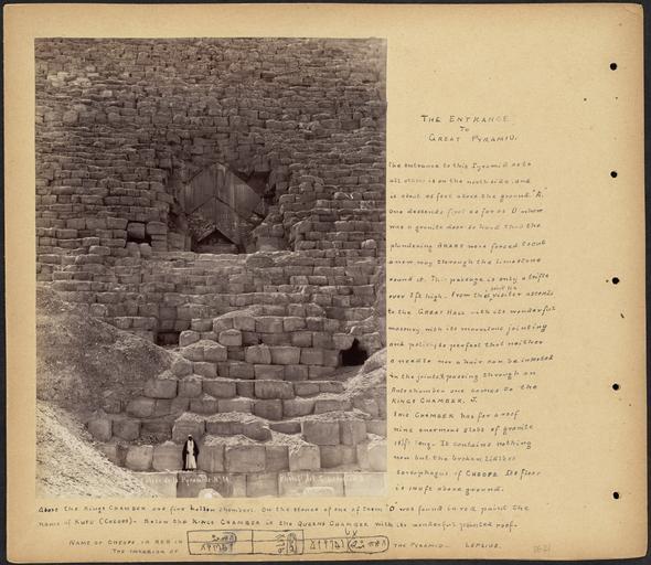 Keywords: The Entrance to Great Pyramid by Boston Public Library.jpg Scrapbook page containing one annotated photograph of a man standing in front of the entrance to the Cheops Pyramid in Egypt The page includes a sketch of Cheops s name in hieroglyphics which is painted in the interior of the pyramid Subjects Egypt travel photography pyramids tombs Jīzah Ahrāmāt al- Page size 33 x 38 1 cm Annotations The entrance to this pyramid as to all others is on the north side and is about 45 feet above the ground A One descends first as far as D where was a granite door so hard that plundering Arabs were forced to cut a new way through the limestone round it This passage is only a trifle over 3 ft high From this point the visitor ascends to the Great Hall with its wonderful masonry with its marvelous jointing and polish so perfect that neither a needle nor a hair can be inserted between the joints Passing through an Antechamber one comes to the Kings Chamber J This chamber has for a roof nine enormous slabs of granite 18 ½ ft long it contains nothing now but the broken lidless sarcophagus of Cheops Its floor is 140 ft above ground Above the Kings Chamber are five hollow chambers On the stones of one of them O was found in red paint the name of Kufu Cheops - Below the Kings Chamber is the Queens Chamber with its wonderful pointed roof- Name of Cheops in red in the interior of the Pyramid- Lepsius Language English photograph has French title Rights No known restrictions Coverage Egypt Notes Title supplied by cataloger derived from captions or annotated information Letters mentioned in annotation correspond with a diagram on the following page Format Scrapbooks Technique Photographs Albumen prints BPL Department Print Department Photo 1 Photographer G Lékégian Cie Title Entrée de la Pyramide No 14 Caption The Entrance to Great Pyramid Date ca 1865-1895 Flickr data on 2011-08-03 Camera Sinar AG Sinarback 54 FW Sinar m License CC BY 2 0 User Boston Public Library BPL Flickr http //flickr com/photos/24029425 N06/2469130012 The Entrance to Great Pyramid December 21 1892 March 8 1893 Flickr upload date 2008-05-01 17 11 19 William Vaughn Tupper Flickr uploader http //www flickr com/people/24029425 N06 BPL User Flickr upload bot/upload 14 49 3 August 2011 UTC Fæ CC BY 2 0 PD-old-100 Historical images of Great Pyramid 1890s Tupper Scrapbooks volume 26 Lower Egypt G Lekegian Entrance of the Great Pyramid of Giza 1890s Photos uploaded from Flickr by Fæ using a script