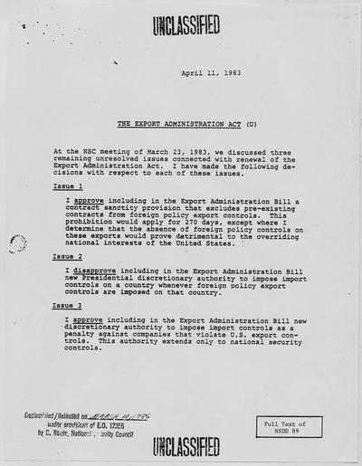 | Keywords: The Export Administration Act - NARA - 198236.tif Scope and content General notes 198236 Local identifier President 1981-1989 Reagan National Security Council 1981 - 1989 Ronald Reagan Library NLRR 40 Presidential Drive Simi Valley CA 93065-0600 1983-04-11 Record group Collection RR-NSC Numbered National Security Policy Papers 1981 - 1989 Record group ARC 1189 National Security Decision Directives compiled 02/25/1981 - 01/19/1989 Series ARC 198166 File unit File unit ARC Variant control numbers NAIL Control Number NLS-NSC-NSDD-89 yes Other versions <gallery> File The_Export_Administration_Act_-_NARA_-_198236 tif tif File The_Export_Administration_Act_-_NARA_-_198236 jpg jpg </gallery> NARA-cooperation PD-USGov Presidential Decision Directives Reagan NARA TIF images with categorized JPGs |