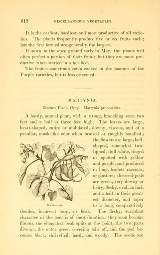 Keywords: The field and garden vegetables of America (Page 612) (6002099421).jpg 612 <br> MISCELLANEOUS VEGETABLES <br> It is the earliest hardiest and most productive of all varie- <br> ties The plants frequently produce five or six fruits each ; <br> but the first formed are generally the largest <br> If sown in the open ground early in May the plants will <br> often perfect a portion of their fruit ; but they are most pro- <br> ductive when started in a hot-bed <br> The fruit is sometimes eaten cooked in the manner of the <br> Purple varieties but is less esteemed <br> MARTYNIA <br> Unicorn Plant Gray Martynia proboscidea <br> A hardy annual plant with a strong branching stem two <br> feet and a half or three feet high The leaves are large <br> heart-shaped entire or undulated doAvny viscous and of a <br> peculiar musk-like odor when bruised or roughly handled ; <br> the flowers are large bell- <br> shaped somewhat two- <br> lipped dull-white tinged <br> or spotted with yellow <br> and purple and produced <br> in long leafless racemes <br> or clusters ; the seed-pods <br> are green very downy or <br> hairy fleshy oval an inch <br> and a half in their great- <br> est diameter and taper <br> The Martynia tO a ldlg COllipa HI t \ Ay <br> slender incurved horn or beak The fleshy succulent <br> character of the pods is of short duration they soon become <br> fibrous the elongated beak splits at the point the two parts <br> diverge the outer green covering falls off and the pod be- <br> comes black shrivelled hard and woody The seeds are 29062950 92326 42073 Page 612 Text http //www biodiversitylibrary org/page/29062950 1863 10 5962/bhl title 42073 Burr Fearing NameFound Martynia NameConfirmed Martynia L EOLID 61735 NameFound Martynia proboscidea NameConfirmed Martynia proboscidea Gloxin EOLID 492400 NameBankID 617768 Biodiversity Heritage Library The field and garden vegetables of America United States Varieties Vegetable gardening Vegetables Library Congress bhl page 29062950 dc identifier http //biodiversitylibrary org/page/29062950 united states Information field Flickr posted date ISOdate 2011-08-02 CC-BY-2 0 BioDivLibrary https //flickr com/photos/61021753 N02/6002099421 2015-09-10 20 56 06 cc-by-2 0 PD-old-70-1923 The field and garden vegetables of America Photos uploaded from Flickr by Fæ using a script