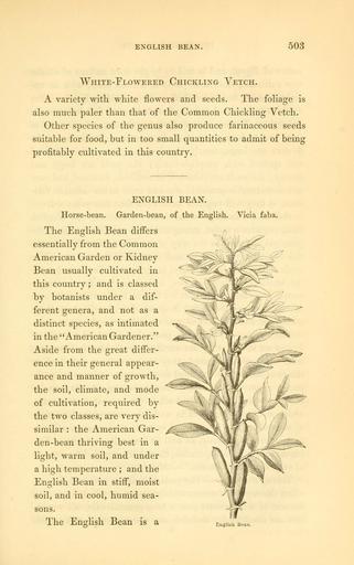 Keywords: The field and garden vegetables of America (Page 503) (6002097871).jpg ENGLISH BEAN <br> 503 <br> White-Flowered Chickling Vetch <br> A variety with white flowers and seeds The foliage is <br> also much paler than that of the Common Chickling Vetch <br> Other species of the genus also produce farinaceous seeds <br> suitable for food but in too small quantities to admit of being <br> profitably cultivated in this country <br> ENGLISH BEAN <br> Horse-bean Garden-bean of the English Vicia faba <br> The English Bean differs <br> essentially from the Common <br> American Garden or Kidney <br> Bean usually cultivated in <br> this country ; and is classed <br> by botanists under a dif- <br> ferent genera and not as a <br> distinct species as intimated <br> in the American Gardener <br> Aside from the great differ- <br> ence in their general appear- <br> ance and manner of growth <br> the soil climate and mode <br> of cultivation required by <br> the two classes are very dis- <br> similar the American Gar- <br> den-bean thriving best in a <br> light warm soil and under <br> a high temperature ; and the <br> English Bean in stiff moist <br> soil and in cool humid sea- <br> sons <br> The Ensrlish Bean is a 29062841 92326 42073 Page 503 Text http //www biodiversitylibrary org/page/29062841 1863 10 5962/bhl title 42073 Burr Fearing NameFound Vicia faba NameConfirmed Vicia faba EOLID 703202 NameBankID 2650790 Biodiversity Heritage Library The field and garden vegetables of America United States Varieties Vegetable gardening Vegetables Library Congress bhl page 29062841 dc identifier http //biodiversitylibrary org/page/29062841 united states Information field Flickr posted date ISOdate 2011-08-02 CC-BY-2 0 BioDivLibrary https //flickr com/photos/61021753 N02/6002097871 2015-09-10 21 02 14 cc-by-2 0 PD-old-70-1923 The field and garden vegetables of America Photos uploaded from Flickr by Fæ using a script |