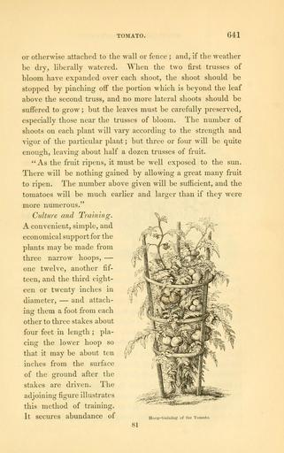 | Keywords: The field and garden vegetables of America (Page 641) (6002102041).jpg TOMATO <br> 641 <br> or otherwise attached to the wall or fence ; and If the weather <br> be dry liberally watered When the two first trusses of <br> bloom have expanded over each shoot the shoot should be <br> stopped by pinching off the portion which is beyond the leaf <br> above the second truss and no more lateral shoots should be <br> suffered to grow ; but the leaves must be carefully preserved <br> especially those near the trusses of bloom The number of <br> shoots on each plant will vary according to the strength and <br> vigor of the particular plant ; but three or four will be quite <br> enough leaving about half a dozen trusses of fruit <br> As the fruit ripens it must be well exposed to the sun <br> There will be nothing gained by allowing a great many fruit <br> to ripen The number above given will be sufficient and the <br> tomatoes will be much earlier and larger than if they were <br> more numerous <br> Culture and Training <br> A convenient simple and <br> economical support for the <br> plants may be made from <br> three narrow hoops ” <br> one twelve another fif- <br> teen and the third eight- <br> een or twenty inches in <br> diameter ” and attach- <br> ing them a foot from each <br> other to three stakes about <br> four feet in length ; pla- <br> cing the lower hoop so <br> that it may be about ten <br> inches from the surface <br> of the ground after the <br> stakes are driven The <br> adjoining figure illustrates <br> this method of training <br> It secures abundance of <br> Hoop-training of llie Tomato <br> SI 29062979 92326 42073 Page 641 Text http //www biodiversitylibrary org/page/29062979 1863 10 5962/bhl title 42073 Burr Fearing Biodiversity Heritage Library The field and garden vegetables of America United States Varieties Vegetable gardening Vegetables Library Congress bhl page 29062979 dc identifier http //biodiversitylibrary org/page/29062979 united states Information field Flickr posted date ISOdate 2011-08-02 CC-BY-2 0 BioDivLibrary https //flickr com/photos/61021753 N02/6002102041 2015-09-10 21 03 27 cc-by-2 0 PD-old-70-1923 The field and garden vegetables of America Photos uploaded from Flickr by Fæ using a script |