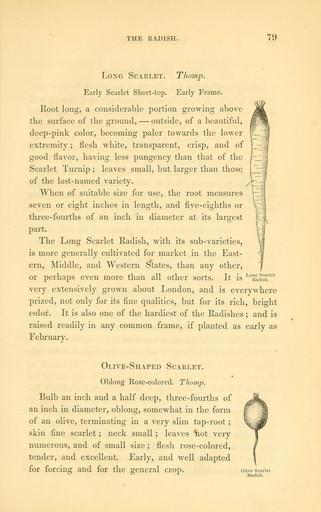 MAKE A MEME View Large Image The field and garden vegetables of America (Page 79) (6002636224).jpg THE RADISH <br> 79 <br> Long Scarlet Thomp <br> Early Scarlet Short-top Early Frame <br> Root long a considerable portion growing above <br> the surface of the ground ” ...