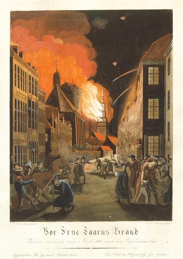 Keywords: The Fire of the Church of Our Lady WDL11251.png Artwork ru Экке сбе г К В К истоффе Вильхельм 1783 1853 гг fr Eckersberg C W Christoffer Wilhelm 1783-1853 en Eckersberg C W Christoffer Wilhelm 1783-1853 zh C·W(克里斯托弗·威廉)·艾克斯伯格,1783-1853 年 pt Eckersberg C W Christoffer Wilhelm 1783-1853 ar إكرسبرغ، كريستوفر ويلهلم، 1783-1853 es Eckersberg C W Christoffer Wilhelm 1783-1853 ru Пожа в це кви Девы а ии fr L'incendie de l'église de Notre Dame en The Fire of the Church of Our Lady zh 母教堂大火 pt O incêndio na Igreja de Nossa Senhora ar حريق كنيسة سيدتنا ru а этом к асочном эстампе изоб ажен пожа в це кви Девы а ии кафед альном собо е Копенгагена случившийся в ночь с 4 на 5 сентяб я 1807 года в пе иод англо-датской войны 1807 1814 гг Эта война была начата Великоб итанией в августе 1807 года после того как Дания отказалась сдать свой флот кото ый как опасались б итанцы мог попасть в уки наполеоновской Ф анции Б итанские войска высадились на те ито ии Дании и 2 сентяб я начали т ехдневную бомба ди овку Копенгагена а т етью ночь обст ела на кафед альном собо е заго елась колокольня и че ез несколько часов сго ев ухнула на землю Основой для этого эстампа выполненного Г Л Ладэ 1765 1833 гг послужила ка тина К В Экке сбе га 1783 1853 гг 1807 года на кото ой запечатлен вид на охваченный огнем х ам с соседней улицы Исто ия це кви Девы а ии восходит к 1209 году когда на самом высоком месте го ода из известняка был пост оен пе воначальный х ам Впоследствии он был уничтожен пожа ом и отст оен заново в 1316 году В оче едной аз х ам пост адал в великом пожа е 1728 года после чего был восстановлен в 1738 году Следующая еконст укция х ама была п оведена после пожа а 1807 года Экке сбе г учился вместе с Жаком-Луи Давидом в Па иже 1748 1825 гг аботал в Риме а в 1818 году получил звание п офессо а Академии изоб азительных искусств в Копенгагене За созданные им аботы и влияние кото ое он оказал на молодое поколение датских художников Экке сбе га называют отцом датской живописи <br>Собо ы; Пожа ы; аполеоновские войны 1800-1815 гг fr Cette estampe aux couleurs vives illustre l'incendie de l'église de Notre Dame cathédrale de Copenhague la nuit du 4 au 5 septembre 1807 pendant la guerre anglo-danoise qui se déroula entre 1807 et 1814 Cette guerre fut déclenchée au mois d'août 1807 par la Grande-Bretagne qui craignait que la flotte danoise tombât aux mains des forces françaises napoléoniennes après son refus de se rendre Les troupes britanniques débarquèrent sur le sol danois et le 2 septembre un bombardement de trois jours sur Copenhague commença Durant la troisième nuit de l'attaque le clocher de la cathédrale prit feu et s'écroula en quelques heures Cette estampe réalisée par G L Lahde 1765 1833 est basée sur un tableau de 1807 peint par C W Eckersberg 1783 1853 qui reproduisit l'incendie vu depuis une rue voisine L'église de Notre Dame remonte à 1209 lorsque le sanctuaire d'origine fut bâti en pierre calcaire sur le site le plus élevé de la ville L'église d'origine fut détruite par les flammes puis reconstruite en 1316 Elle brûla à nouveau dans le grand incendie de 1728 et elle fut rebâtie en 1738 Elle fut également réédifiée après l'incendie de 1807 Eckersberg étudia avec Jacques-Louis David 1748 1825 à Paris travailla à Rome et fut nommée professeur à l'Académie des beaux-arts de Copenhague en 1818 Son œuvre et l'influence qu'il exerça sur la jeune génération de peintres danois lui valurent le nom de « père de la peinture danoise » <br>Cathédrales; Incendies; Guerres napoléoniennes 1800-1815 en This vivid color print shows the burning of the Church of Our Lady the cathedral of Copenhagen on the night of September 4 5 1807 during the Anglo-Danish war of 1807 14 Britain initiated the war in August 1807 after the Danes refused to surrender their fleet which the British feared would fall into the hands of Napoleonic France The British landed troops on Danish soil and on September 2 began a three-day bombardment of the city On the third night of the attack the steeple of the cathedral was set on fire and burned and fell to the ground within hours This print by G L Lahde 1765 1833 is based on an 1807 painting by C W Eckersberg 1783 1853 which captured the conflagration as seen from a neighboring street The Church of Our Lady goes back to 1209 when the original sanctuary was constructed of limestone on the highest point in the town The original church was destroyed in a fire and was reconstructed in 1316 It burned again in the great fire of 1728 but was rebuilt in 1738 It was again rebuilt after the fire of 1807 Eckersberg studied with Jacques-Louis David 1748 1825 in Paris worked in Rome and in 1818 was named professor at the Academy of Fine Arts in Copen