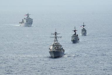 | Keywords: The guided missile destroyer USS John S. McCain (DDG 56), front; the Philippine frigates BRP Gregorio del Pilar (PF 15) and BRP Ramon Alcaraz (PF 16); and the amphibious dock landing ship USS Ashland (LSD 48) 140628-N-YU572-149.jpg en The guided missile destroyer USS John S McCain DDG 56 front; the Philippine frigates BRP Gregorio del Pilar PF 15 and BRP Ramon Alcaraz PF 16 ; and the amphibious dock landing ship USS Ashland LSD 48 left are underway in formation during Cooperation Afloat Readiness and Training CARAT Philippines 2014 in the South China Sea June 28 2014 CARAT is a series of bilateral exercises held annually in Southeast Asia to strengthen relationships and enhance force readiness 2014-06-28 MC1 Jay C Pugh http //www defenseimagery mil/imageRetrieve action guid 19a2af73f16ebc1c2af7acf394f4fa61edd23610 t 2 Public domain photograph from defenseimagery mil http //www defenseimagery mil/imagery html guid 19a2af73f16ebc1c2af7acf394f4fa61edd23610 140628-N-YU572-149 2014-07-01 Unknown PD-USGov-Military-Navy USS Ashland LSD-48 USS John S McCain DDG-56 Cooperation Afloat Readiness and Training 2014 Images from DoD uploaded by Fæ |
