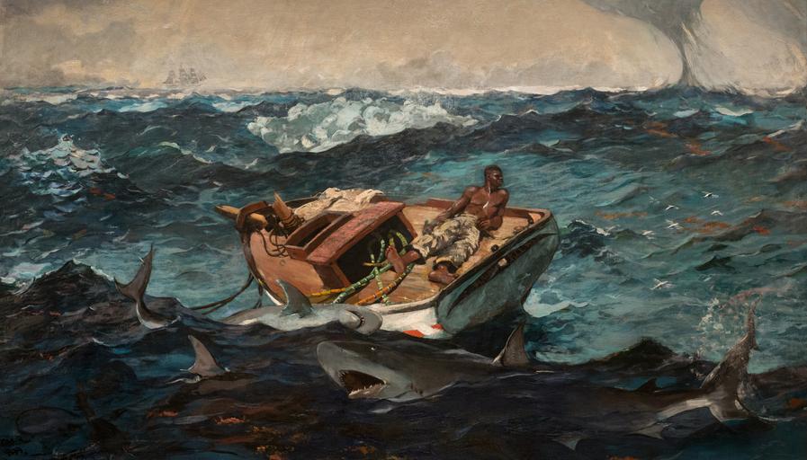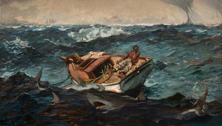 Keywords: painting fine art outdoor Winslow Homer (American, Boston, Massachusetts 1836–1910 Prouts Neck, Maine) 1899, Oil on canvas 28 1/8 x 49 1/8 in. (71.4 x 124.8 cm) The Gulf Stream was based upon studies made during Homer's two winter trips to the Bahamas in 1884–85 and 1898–99. First exhibited at the Pennsylvania Academy of the Fine Arts in Philadelphia in 1900, the picture was subsequently reworked and "improved" by the artist. Early photographs show changes to the sea and to the back of the ship, making the composition more dramatic and vivid. The painting was shown in this state at the Carnegie Institute in Pittsburgh in 1900–1901, and then at M. Knoedler and Co. in New York, where the artist placed on the picture the record-asking price of $4,000. There were problems selling the work because of either its high price or its unpleasant subject matter. Homer may have reworked the painting again in the face of this criticism in order to add the rigger on the horizon that signals hope and rescue from the perils of the sea. Photographed at The Met June 2016. Winslow Homer (American, Boston, Massachusetts 1836–1910 Prouts Neck, Maine) 1899, Oil on canvas 28 1/8 x 49 1/8 in. (71.4 x 124.8 cm) The Gulf Stream was based upon studies made during Homer's two winter trips to the Bahamas in 1884–85 and 1898–99. First exhibited at the Pennsylvania Academy of the Fine Arts in Philadelphia in 1900, the picture was subsequently reworked and "improved" by the artist. Early photographs show changes to the sea and to the back of the ship, making the composition more dramatic and vivid. The painting was shown in this state at the Carnegie Institute in Pittsburgh in 1900–1901, and then at M. Knoedler and Co. in New York, where the artist placed on the picture the record-asking price of $4,000. There were problems selling the work because of either its high price or its unpleasant subject matter. Homer may have reworked the painting again in the face of this criticism in order to add the rigger on the horizon that signals hope and rescue from the perils of the sea. Photographed at The Met June 2016. |